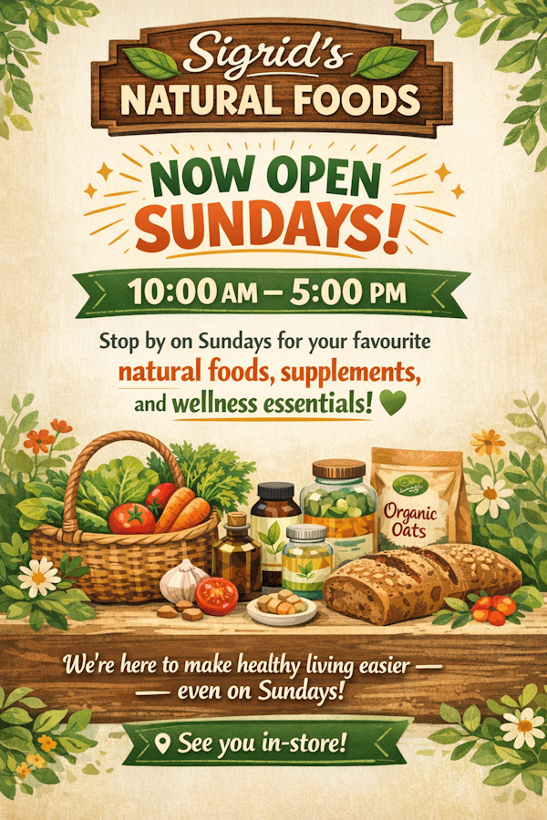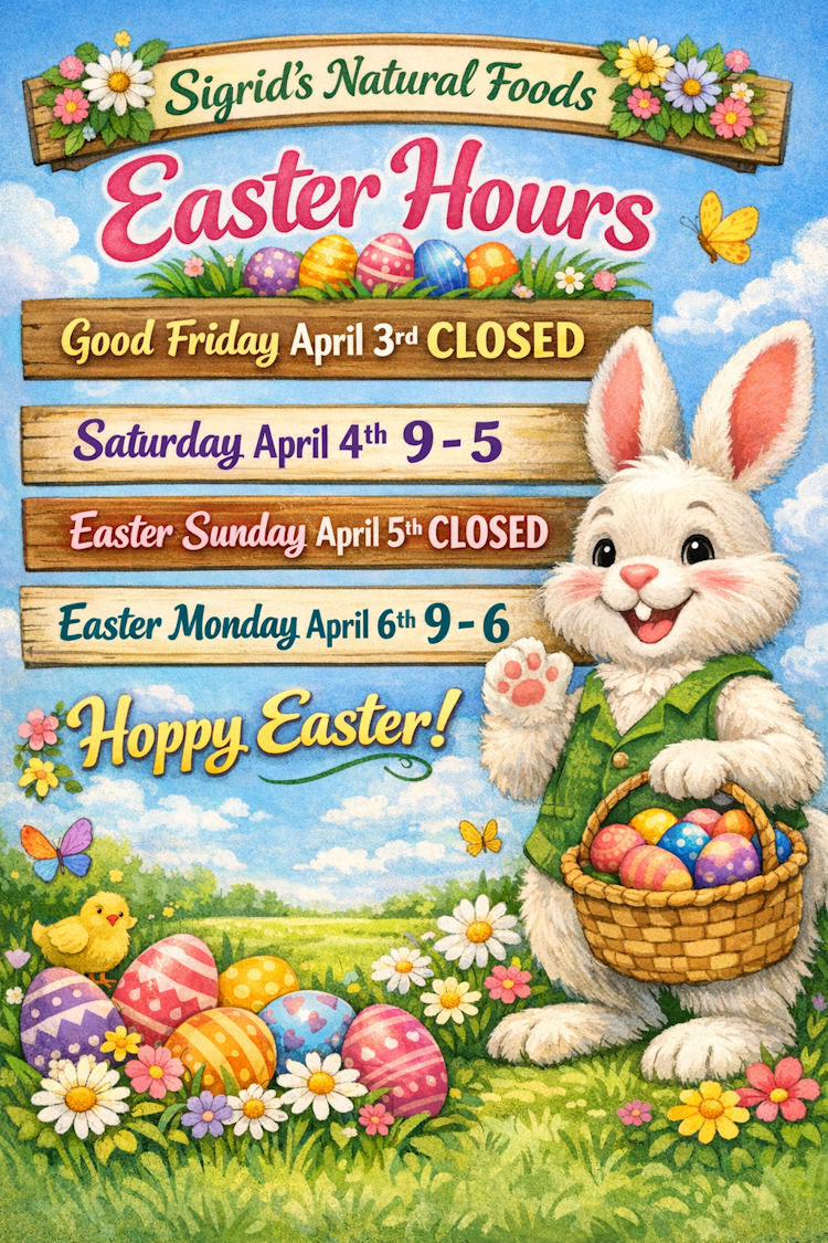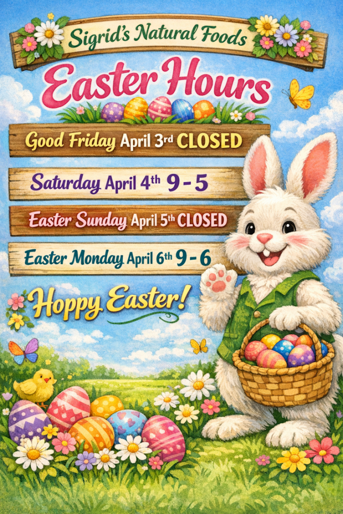 Sigrid’s Natural Foods is independently owned and operated and has been in business for over 35 years. We now carry a full range of groceries (local, organic, natural) as well as a large selection of nutritional supplements and health products. Sigrid’s strives to keep new and exciting products on our shelves and continues to follow the latest health trends.